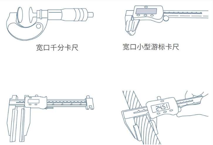 在设备运行操作期间,对钢丝绳直径实施定期测量,可有效采集并获取钢丝绳磨损状态及直径减小的相关数据。值得注意的是,钢丝绳结构若发生变化,亦可能引发其直径增大的现象。为确保测量结果的准确性与可靠性,钢丝绳直径测量需采用适宜的测量工具,其中宽口小型游标卡尺在该测量场景中具备显著应用优势。
